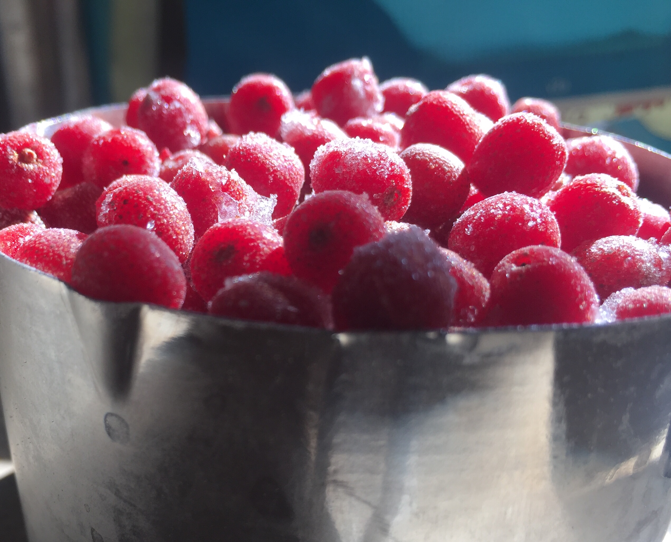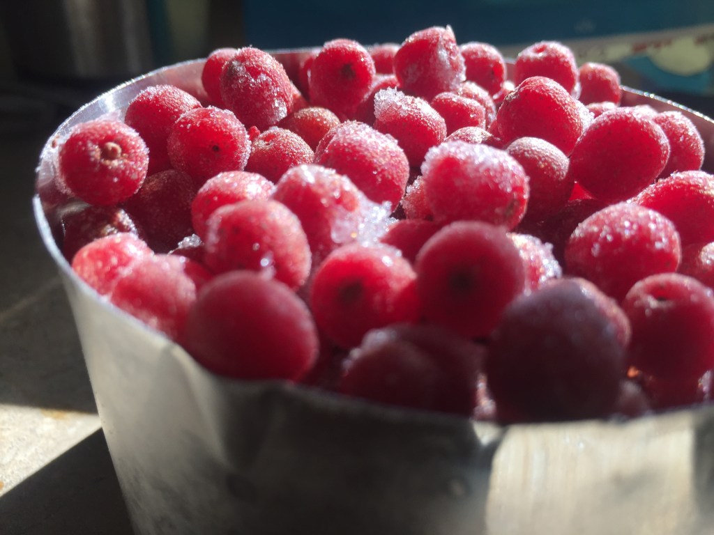 When I walked the field in the fall when I was in the long process of buying the farm, I was very excited to find that all around the edges of the farm there are Autumn Olives growing. They create a prolific crop of small silvery- red, tiny, tart berries each fall that birds love to eat. Fortunately the berry is edible for chickens and humans too, and I harvested many branches for the hens to snack on, and a few pounds to freeze for myself to enjoy throughout the winter.