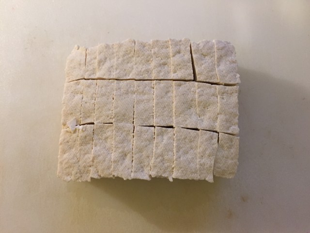 1. Slice the tofu into nuggets, about 1/2″ thick.