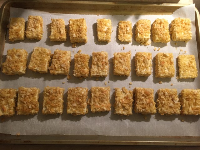 4. Roll each tofu cube in the EVOO, then the cracker mash until well-coated, then place on the parchment paper.