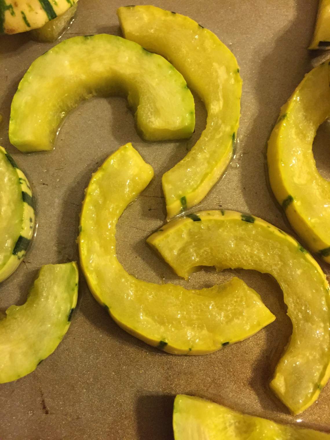 Delicata squash is just such an amazing treat. It’s so sweet and so easy to prepare. Great as an appetizer or on a salad, like a little sunshine on a rainy autumn day.