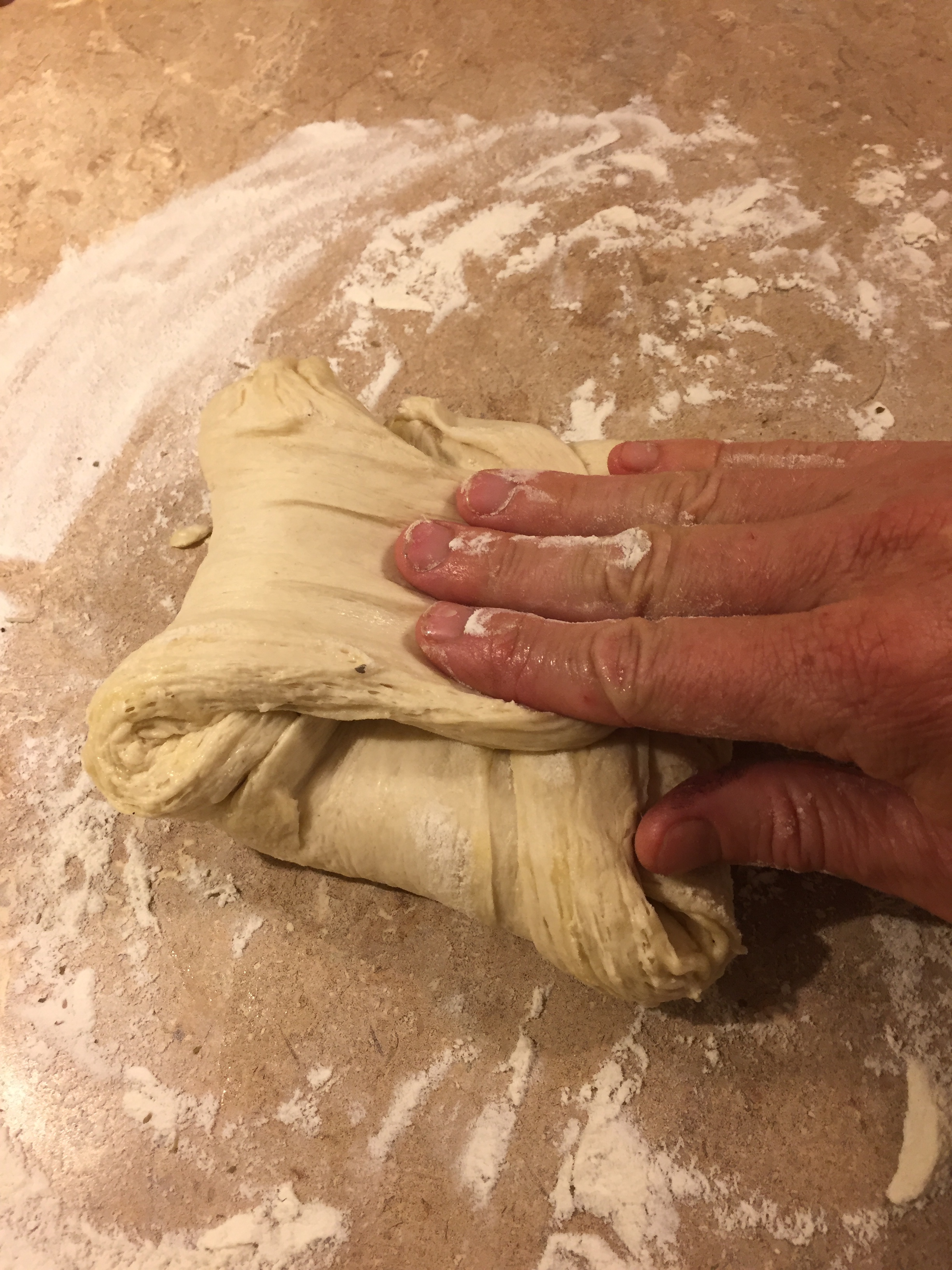 - Dust a clean surface with flour. Place dough ball in the center of floured area. Pull from each side out and fold back on to center. Flip the ball and repeat.