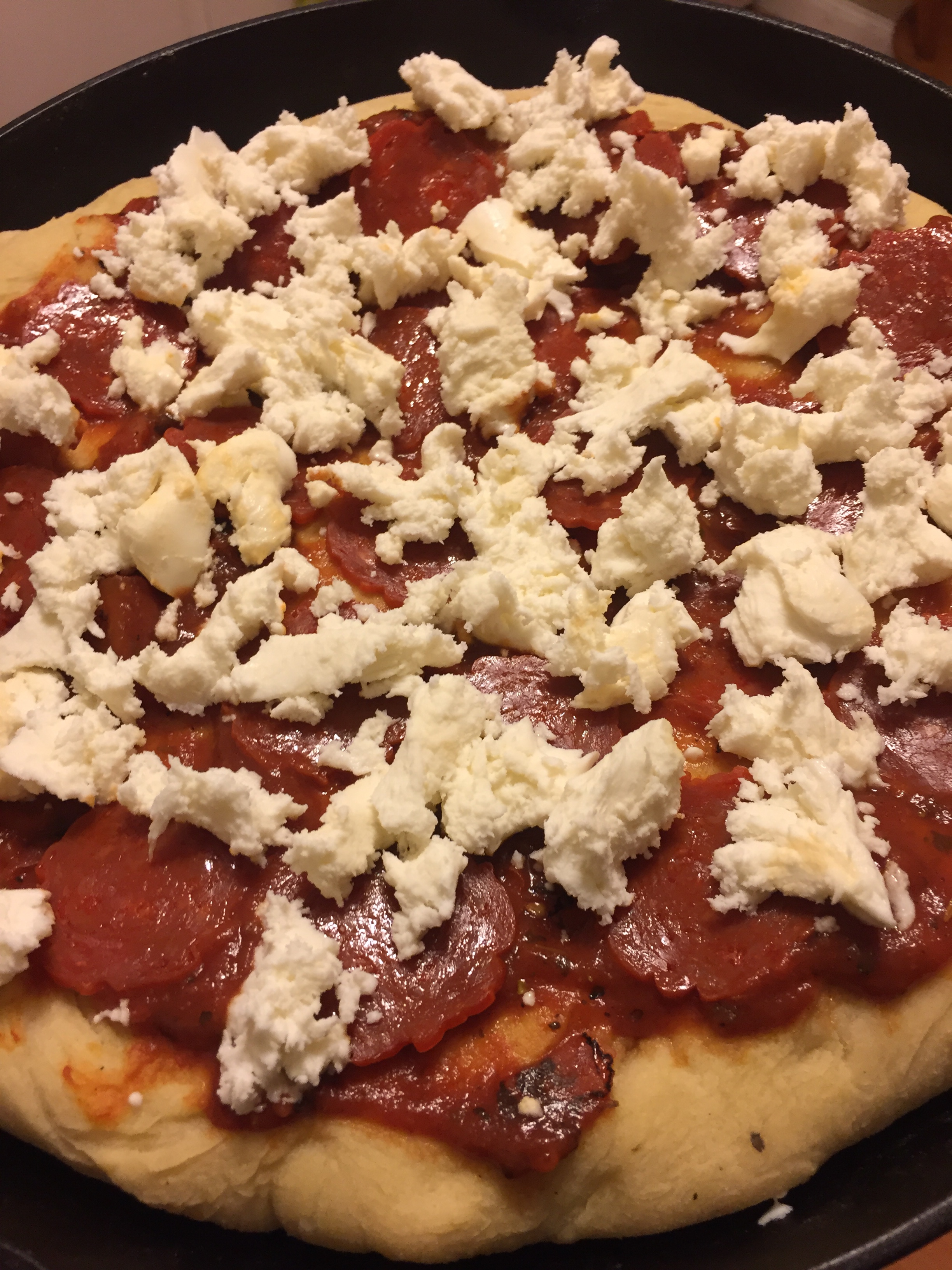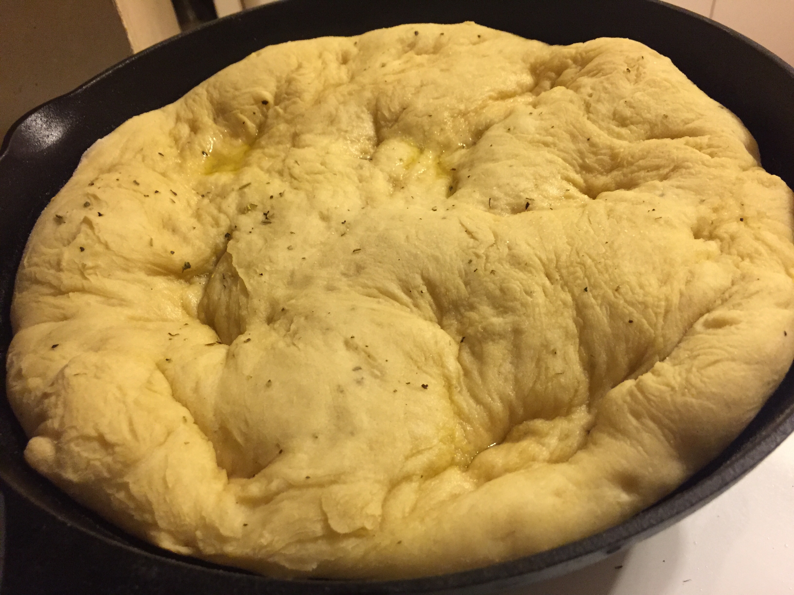 I had trouble finding a single recipe written for handmade focaccia dough destined for cast iron pizza, without the use of a bread machine. So here’s one for the do-it-by-hand-i-don’t-need-no-machine-to-knead type o’ people.