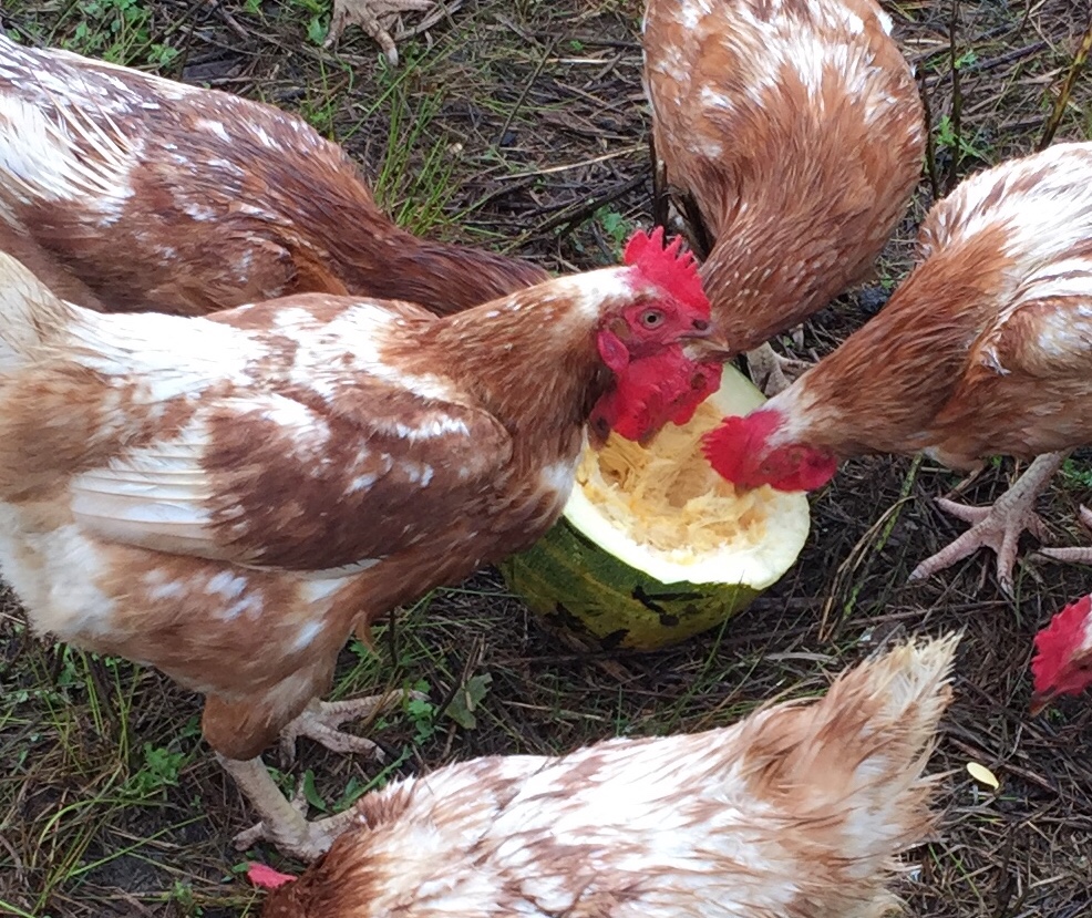 It’s always interesting to see what kinds of squash pop up in the compost pile. The pile had gotten a bit wily with weeds, and after mowing those down, these big ol’ squash were sitting there fully ripe. While I can nearly guarantee they won’t be delicious to you or me, they made the perfect snack for the chickens on a drizzly August morning.