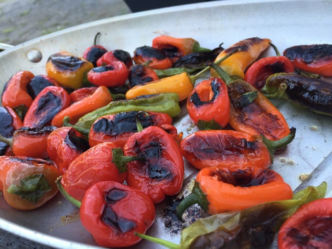 Get you some searing peppers and toss them in a little bit of oil with a tiny bit of salt. Make yourself some charcoal and char up some peps with friends!
